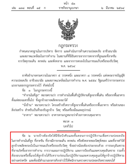 การฝึกอบรมหลักสูตร “ความปลอดภัยในการทำงานบนที่สูง” จัดทำขึ้นตามพระราชบัญญัติความปลอดภัย อาชีวอนามัย และสภาพแวดล้อมในการทำงาน พ.ศ 2554 และพระราชบัญญัติคุ้มครองแรงงาน พ.ศ 2551 โดยกำหนดมาตรฐานในการบริหารและการจัดการด้านความปลอดภัย อาชีวอนามัยและสภาพแวดล้อมในสถานที่ที่มีอันตรายจากการตกจากที่สูงและที่ลาดชัน พ.ศ. 2564