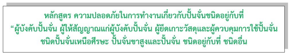 ผู้บังคับปั้นจั่น ผู้ให้สัญญาณ ผู้ยึดเกาะวัสดุ ผู้ควบคุมปั้นจั่นชนิดปั้นจั่นเหนือศีรษะ (หลักสูตรเครน 4 ผู้ชนิดอยู่ที่)