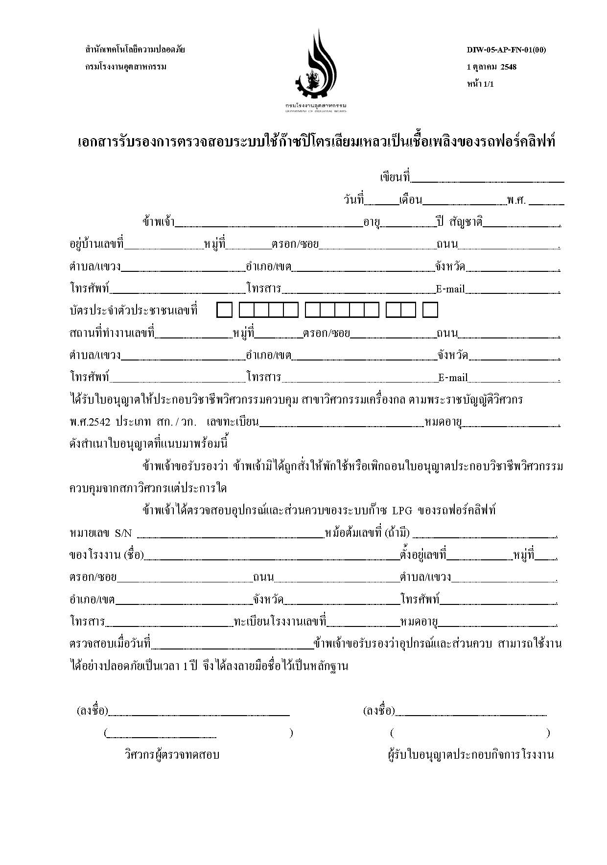 4. การติดตั้งอุปกรณ์และส่วนควบของระบบก๊าซต้องได้รับการตรวจทดสอบรับรองอย่างน้อยปีละครั้ง โดยวิศวกรผู้ได้รับอนุญาตให้ประกอบวิชาชีพวิศวกรรมควบคุม ตามประกาศกระทรวงอุตสาหกรรม เรื่อง รถฟอร์คลิฟท์ (Forklift) ที่ใช้ก๊าซปิโตรเลียมเหลวเป็นเชื้อเพลิง พ.ศ. 2545