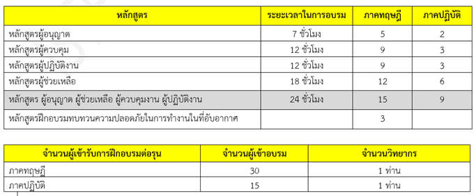 ตามประกาศกรมสวัสดิการและคุ้มครองแรงงาน เรื่อง หลักเกณฑ์ วิธีการ และหลักสูตรการฝึกอบรมความปลอดภัยในการทำงานในที่อับอากาศ โดยที่กฎกระทรวงกำหนดมาตรฐานในการบริหาร จัดการ และดำเนินการด้านความปลอดภัยอาชีวอนามัย และสภาพแวดล้อมในการทำงานเกี่ยวกับที่อับอากาศ พ.ศ. ๒๕๖๒ ข้อ ๒๐ กำหนดให้นายจ้างจัดให้มีการฝึกอบรมความปลอดภัยในการทำงานในที่อับอากาศแก่ลูกจ้างทุกคนที่ทำงานในที่อับอากาศ รวมทั้งผู้ที่เกี่ยวข้องให้มีความรู้ความเข้าใจในทักษะที่จำเป็นในการทำงานอย่างปลอดภัย ตามหน้าที่ที่ได้รับมอบหมาย พร้อมทั้งวิธีการและขั้นตอนในการปฏิบัติงานตามหลักเกณฑ์ วิธีการ และหลักสูตรที่อธิบดีประกาศกำหนด