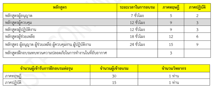 ตามประกาศกรมสวัสดิการและคุ้มครองแรงงาน เรื่อง หลักเกณฑ์ วิธีการ และหลักสูตรการฝึกอบรมความปลอดภัยในการทำงานในที่อับอากาศ โดยที่กฎกระทรวงกำหนดมาตรฐานในการบริหาร จัดการ และดำเนินการด้านความปลอดภัยอาชีวอนามัย และสภาพแวดล้อมในการทำงานเกี่ยวกับที่อับอากาศ พ.ศ. ๒๕๖๒ ข้อ ๒๐ กำหนดให้นายจ้างจัดให้มีการฝึกอบรมความปลอดภัยในการทำงานในที่อับอากาศแก่ลูกจ้างทุกคนที่ทำงานในที่อับอากาศ รวมทั้งผู้ที่เกี่ยวข้องให้มีความรู้ความเข้าใจในทักษะที่จำเป็นในการทำงานอย่างปลอดภัย ตามหน้าที่ที่ได้รับมอบหมาย พร้อมทั้งวิธีการและขั้นตอนในการปฏิบัติงานตามหลักเกณฑ์ วิธีการ และหลักสูตรที่อธิบดีประกาศกำหนด